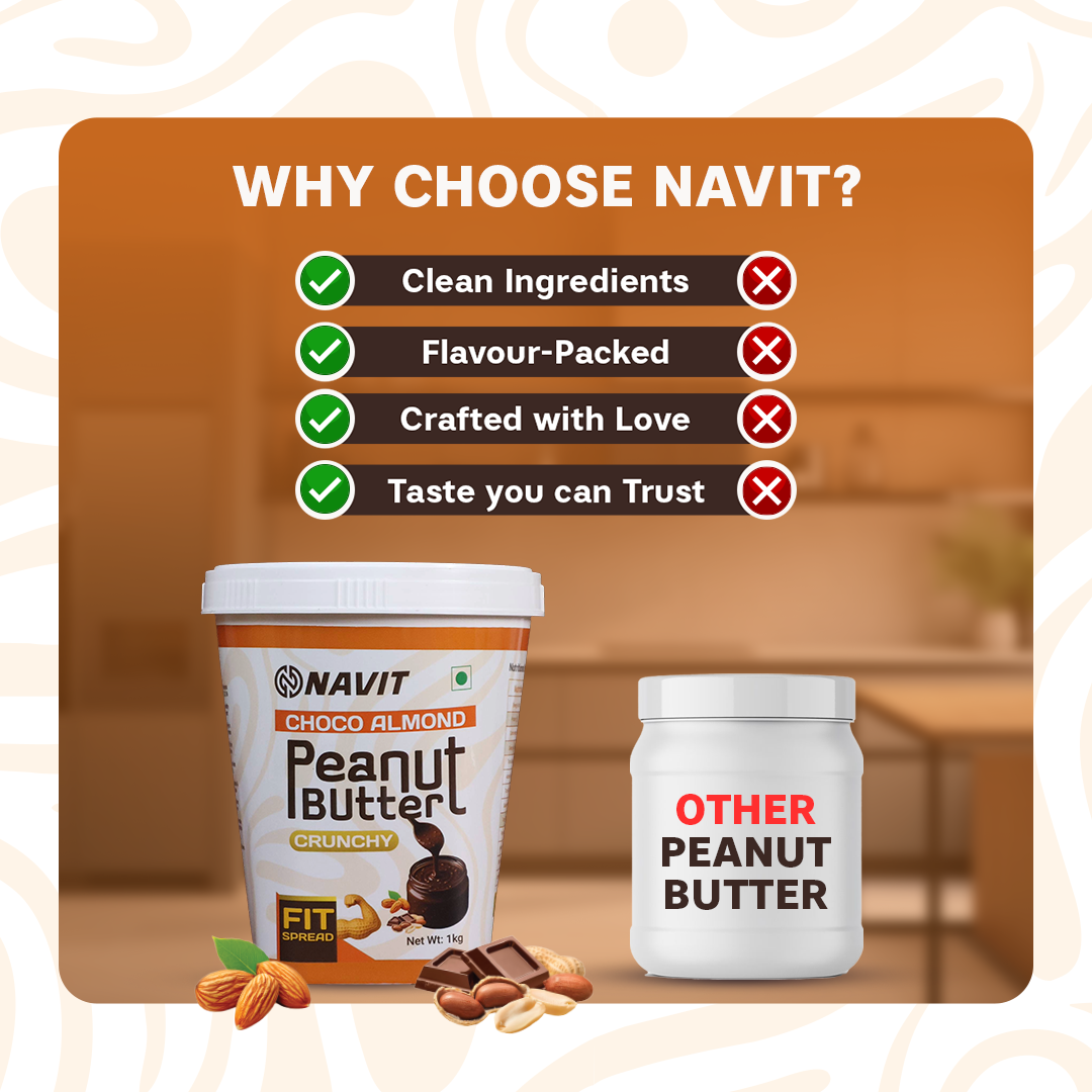 Navit Choco Almond Peanut Butter combines premium almonds and peanuts with a rich chocolate flavour. Packed with protein, healthy fats, and vitamin E, it supports strength, energy, and everyday nutrition.