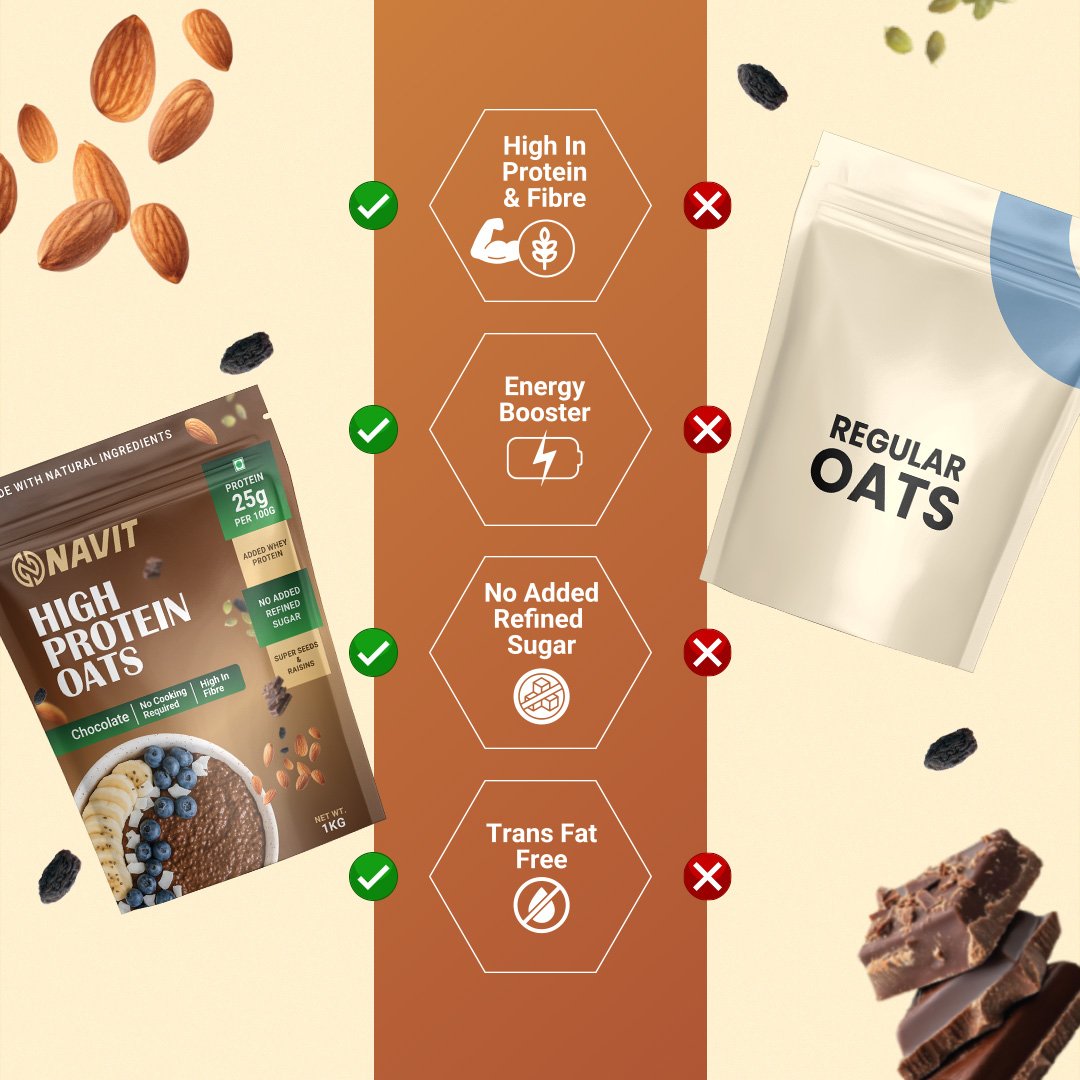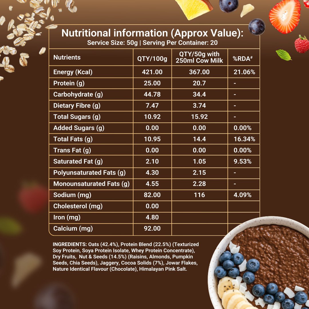 With no unnecessary junk and a balanced nutritional profile, Chocolate High Protein Oats make healthy living simple, satisfying, and consistent.